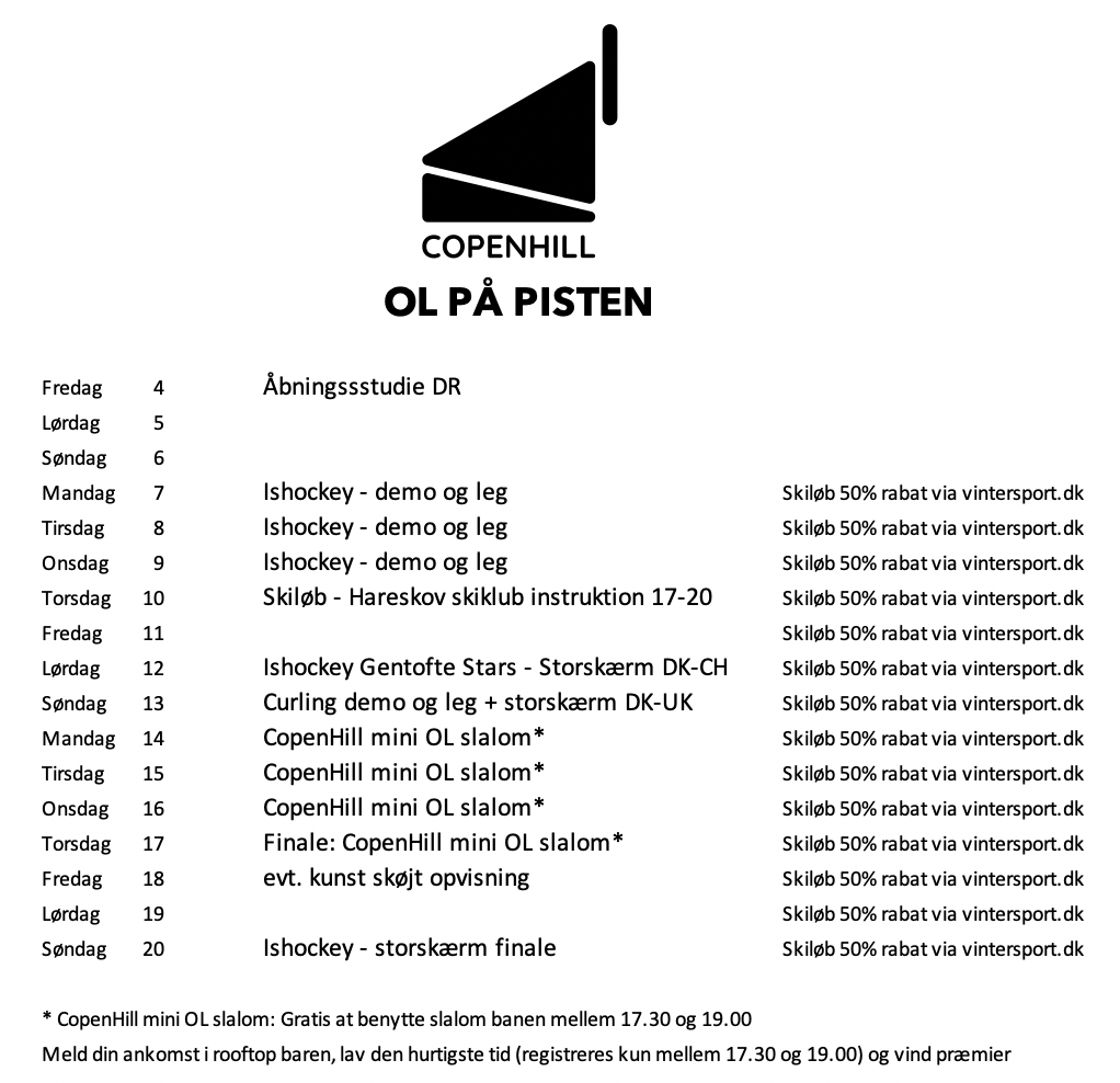 Vi hepper på atleterne ved at fejre vintersportsgrenene Curling, Skøjteløb, Ishockey og Skiløb på CopenHill. Repræsentanter fra klubber og forbund har arrangeret en masse forskellige aktiviteter under OL perioden, og mellem 4. og 20. februar har du derfor mulighed for at komme ud og prøve kræfter med skiløb, kælkning, ishockey, curling, og skøjteløb.