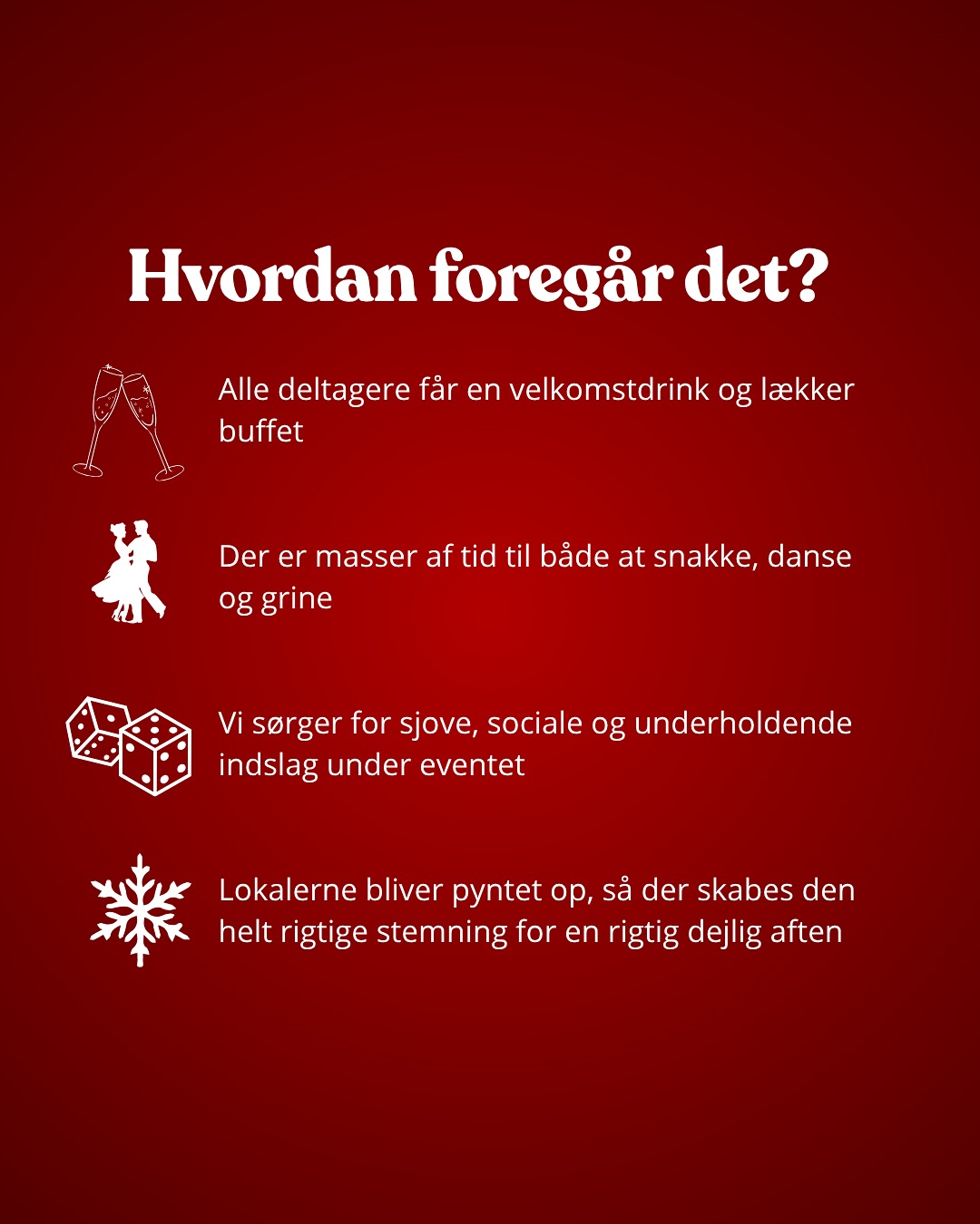 Her samler vi op til 80 singler til en aften fyldt med julestemning, lækker mad, musik og nye forbindelser. Uanset om du leder efter kærlighed, grin eller bare en fantastisk fest – så er dette stedet at være.